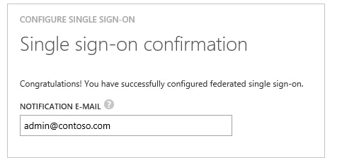 11.On the Azure classic portal, select the single sign-on configuration confirmation, and then click Complete to close the Configure Single Sign On dialog.