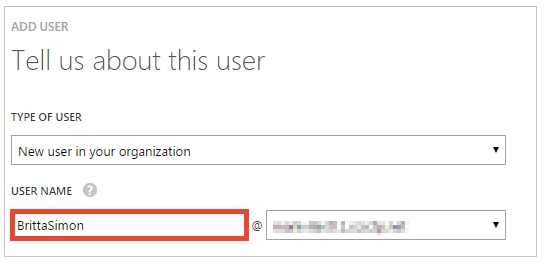 a. As Type Of User, select New user in your organization.b. In the User Name textbox, type BrittaSimon.c. Click Next. - On the User Profile dialog page, perform the following steps: