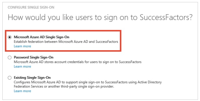- On the How would you like users to sign on to SuccessFactors page, select Microsoft Azure AD Single Sign-On, and then click Next.