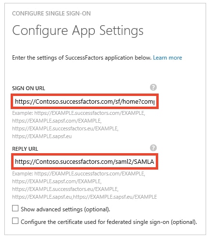 Note : Please note that these are not the real values. You have to update these values with the actual Sign On URL and Reply URL. To get these values, contact SuccessFactors support team.