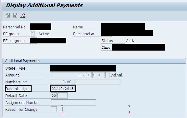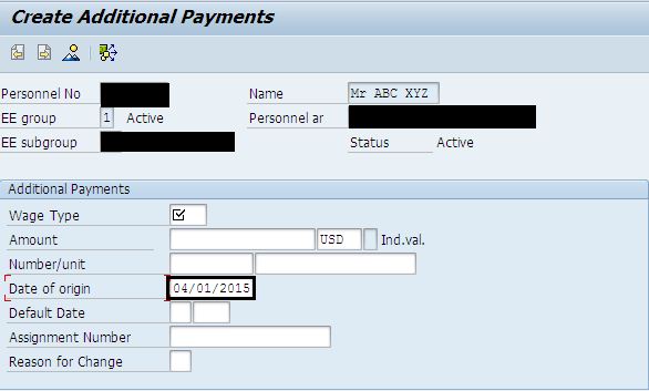 Pressing create button, date of origin (begda) value is defaulted with correct value. [Based on current date- 13-apr-2015, pay period begin date 01-apr-2015 is defaulted].