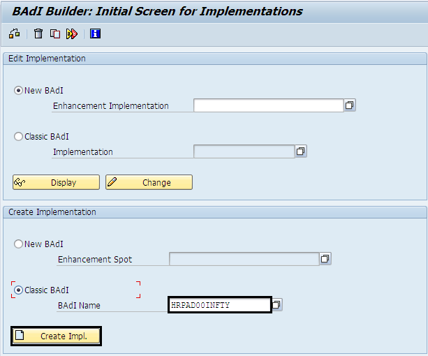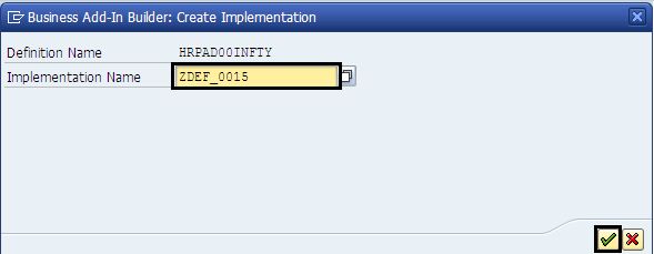 1. Go to transaction SE19, create implementation of classic BADI HRPAD00INFTY and give implementation name (name should be in SAP customer name space, i.e should start from ‘Y’ or ‘Z’).