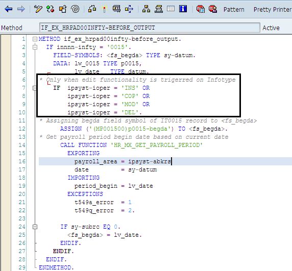| BEFORE_OUTPUT | This method is called at the PBO event, i.e when the infotype screen is rendered for display. |
