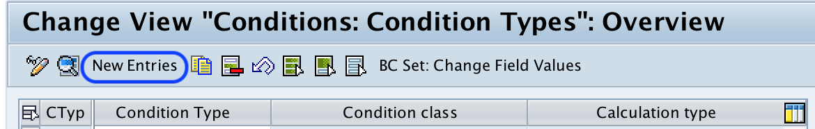 On change view conditions: condition types overview screen, choose the new entries button to create the new condition types in SAP for GST implementation.