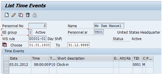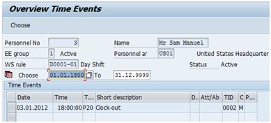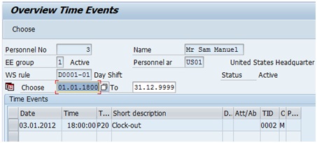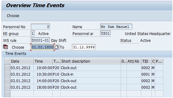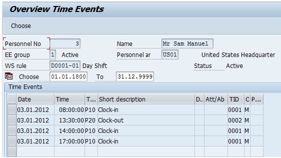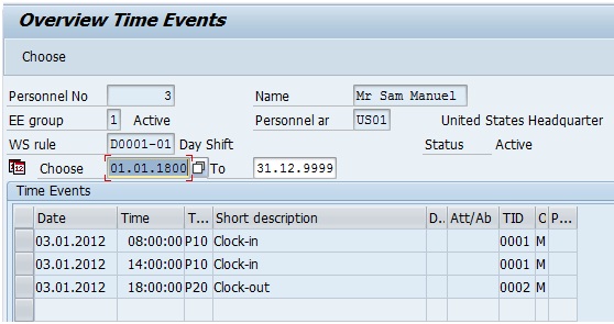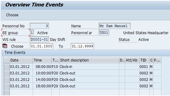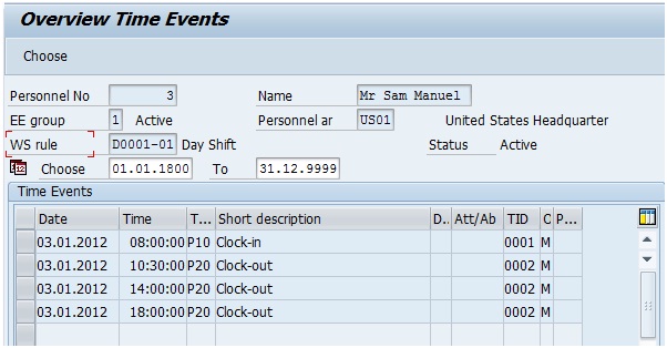 Please refer the below screenshot for time events in IT2011 to understand the shortcomings. The employee recorded a clock in at 08:00:00 and then clock outs at 10:30:00, 14:00:00 and 18:00:00 on 03-Jan-12.