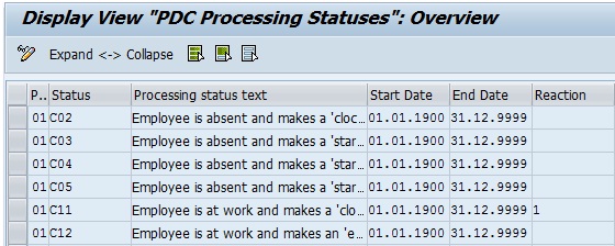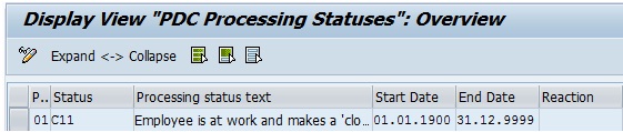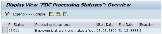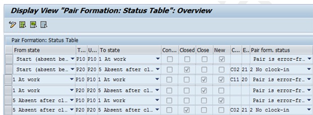 Let us refer to the 3rd row in Table TPT_PAIRSTAT2 Screenshot A. The employee was at work and a clock in was recorded. The field “Close” is checked and hence, it will close the open pair. Also, the field “New” is checked and hence, it will start the creation of a new time pair. The PDC Processing Status in field “Customer Adjustment” is C11. The reaction indicator for PDC Processing Status C11 is 1. If the reaction is 1, the system will end ongoing time pair with the current clock in time and also start a new time pair with the same clock in time. If the reaction for PDC Processing Status is blank, the system will give an error that clock in is missing.