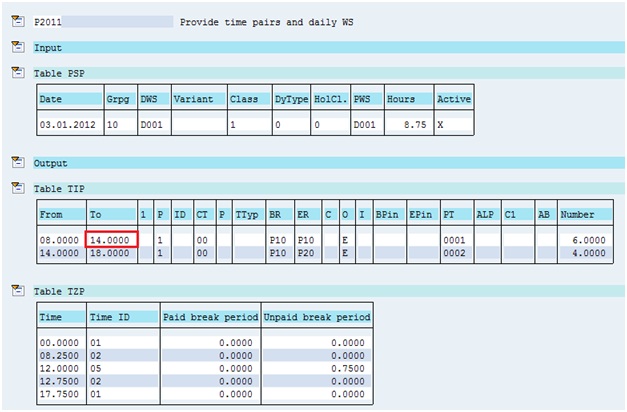 P2011 – There wasn’t any clock out at 14.0000. However, the system closes the existing open pair with the clock in time and starts a new time pair with the same clock in time. This is due to PDC Processing Status C11 and its return code as 1.