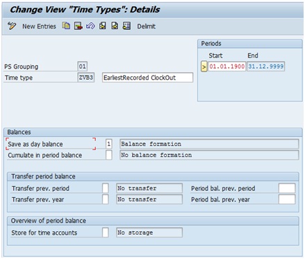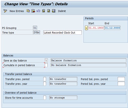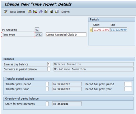 - Currently, the value of ZVB3 and ZVB4 are 10.0000 and 12.0000 respectively. Let us assume now that the next time pair with end time has end time as 18:00:00. This time pair will get processed through Y (OUTTPEXETM). The value of time type ZVB3 is read using HRS=DZVB3 (ZVB3 = 10.0000). This value is compared with 0 using HRS?0 and since the value of ZVB3 (10.0000) is greater than 0, the time pair gets processed under >. Then the end time of the time pair is read using HRS=PEND (HRS = 18.0000) and it is compared with “earliest recorded clock out” time type ZVB3 (10.0000) using HRS?DZVB3. Since the value of HRS=PEND (18.0000) is greater than “earliest recorded clock out” time type ZVB3 (10.0000), the time pair gets processed under >. Then the value of HRS=PEND (18.0000) is compared with “latest recorded clock out” time type ZVB4 (12.0000). Since the value of HRS=PEND (18.0000) is greater than ZVB4 (12.0000), the end time of this time pair is the new “latest recorded clock out” for this shift and the time pair is processed under *. Hence, the end time (18.0000) of the current time pair is fed into daily time type ZVB4 after removing its old value 12.0000 using ADDDBZVB4Z and the time pair is moved to output table using COLOP *.