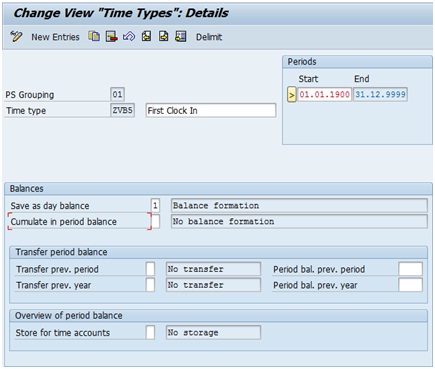 - Currently, the value of ZVB1 and ZVB2 are 08.0000 and 10.0000 respectively. Let us assume now that the next time pair with start time has start time as 15:00:00. This time pair will get processed through Y (OUTTPEXBTM). The value of time type ZVB1 is read using HRS=DZVB1 (ZVB1 = 08.0000). This value is compared with 0 using HRS?0 and since the value of ZVB1 (08.0000) is greater than 0, the time pair gets processed under >. Then the start time of the time pair is read using HRS=PBEG (HRS = 15.0000) and it is compared with “earliest recorded clock in” time type ZVB1 (08.0000) using HRS?DZVB1. Since the value of HRS=PBEG (15.0000) is greater than “earliest recorded clock in” time type ZVB1 (08.0000), the time pair gets processed under >. Then the value of HRS=PBEG (15.0000) is compared with “latest recorded clock in” time type ZVB2 (10.0000). Since the value of HRS=PBEB (15.0000) is greater than ZVB2 (10.0000), the start time of this time pair is the new “latest recorded clock in” for this shift and it gets processed under >. Hence, the start time (15.0000) of the current time pair is fed into daily time type ZVB2 after removing its old value 10.0000 using ADDDBZVB2Z and the time pair is moved to output table using COLOP *.