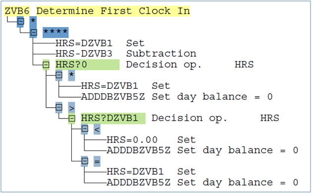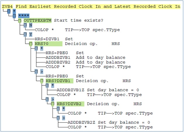 - After reading the value of time type ZVB1, it is compared with 0 using HRS?0. If the value of ZVB1 is not greater than 0, it is processed under * and the start time of the time pair is read using HRS=PBEG. The start time is added to time types ZVB1 (earliest recorded clock in) and ZVB2 (latest recorded clock in) and the time pair is moved to output table using COLOP *.