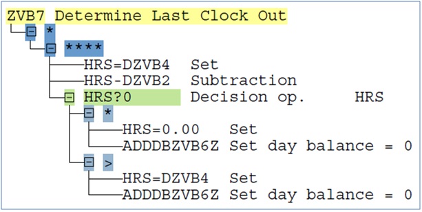 - After reading the value of time type ZVB3, it is compared with 0 using HRS?0. If the value of ZVB3 is not greater than 0, then the time pair gets processed under * and the end time of the time pair is read using HRS=PEND. The end time is added to time types ZVB3 (earliest recorded clock out) and ZVB4 (latest recorded clock out) and the time pair is moved to output table using COLOP *.
