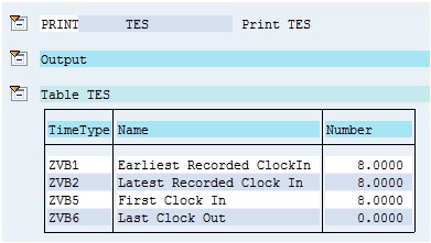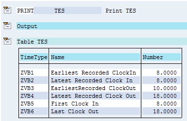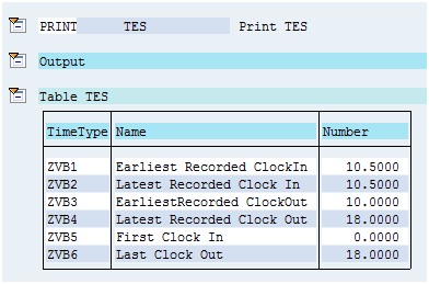 In the same way, I have included function PRINT after PCRs ZVB6 and ZVB7 to print table TES to display the value of time types ZVB5 and ZVB6 which get generated in these PCRs.
