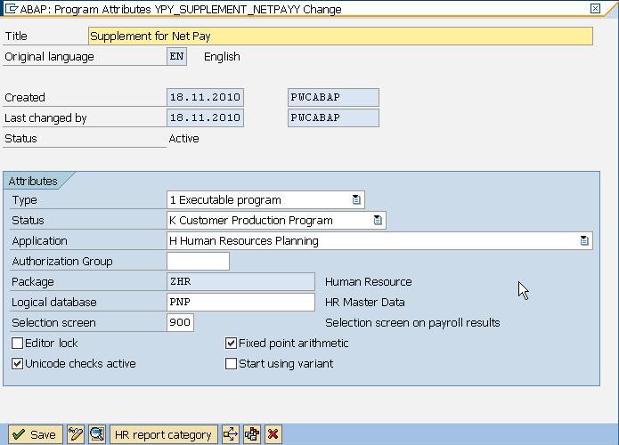 - Creating a report ‘YPY_SUPPLEMENT_NETPAYY’ with following details and don’t forget to include PNP and Selection Screen 0900.