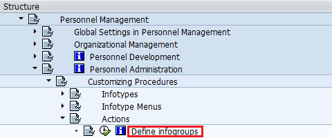SAP IMG Path: – SPRO > SAP Reference IMG (F5) > SAP Customizing Implementation Guide > Personnel Management > Personnel Administration >> Customizing Procedures > Actions > Define Infogroups