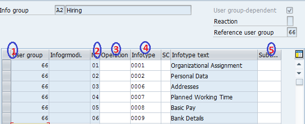 - Operation defines the editing mode which should be used to process the info type in an action. Standard SAP delivered with certain operations to control the infotypes performance e.g. as COP, DEL, EDQ, INS. Here we are selecting INS to create the info group, in the same way we have to create info group for the separation and change.
