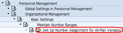 SAP R/3 IMG Path: – IMG –> Personnel Management –> Organizational Management –> Basic Settings –> Maintain Number Ranges –> Set Up Number Assignment for All Plan Versions