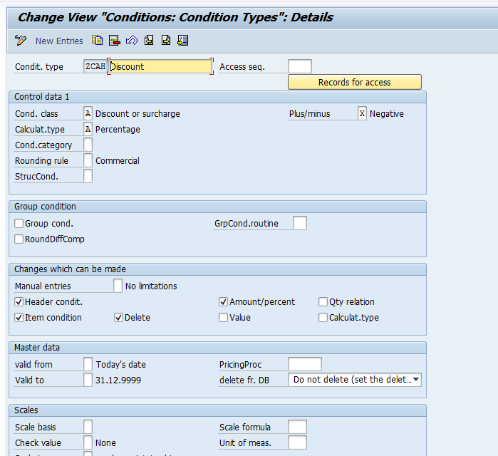 Here I have maintain ZCAH as discount, I give condition class A, Calculation type A, Plus/Minus X-Negative