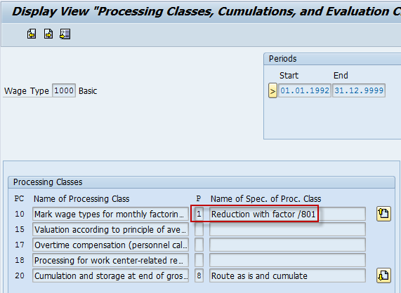 In International Payroll, as you may know, technical wage types are very important, such as: /801, /802, etc. These wage types contain factoring and will be multiplied with current values in wage types (inputted in PA30 Personnel Administration) and final results are employee’s salary. In order to easier understand, let’s see an example below: employee A has basic salary (wage type 1000) in IT0008 with value 1000$. And his salary is calculated by multiplying wage type 1000 with technical wage type /801. If he works full month, rate in /801 is 1, so he gets full basic salary 1000$. If he absences (unpaid or leave without pay), of course Rate in /801 is decreased (it’s lower than 1), his salary is reduced as well.
