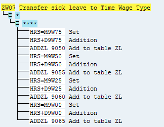 Absence Code of Sick Leave is 1020. Whenever data in TIP retrieved from Absence (Origin status is A) and Subtype is 1020 in internal table TIP, plus 1 into time type 9WSL. Thanks to configure in V_T555A, value in Time Type 9WSL will be accumulated in Function CUMBT. PCR ZW05 is inserted into Time Schema ZW04 as below (ZW04’s copied from standard schema TM04): after successfully call function P2001.
