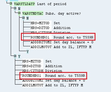 The client had additional requirement to round off overtime hours generated in the wage type. Any value between 0 and < 0.5 should get rounded off to 0 and any value between 0.5 and < 1.0 should get rounded off to 1.0 and this should be rolling over.