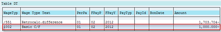 After running ZW09, 1 record for wage type 1002 created in DT table, value is -1000, because in actual payroll Feb-2012 (Feb-2012 in Feb-2012) his basis salary was only 1000.